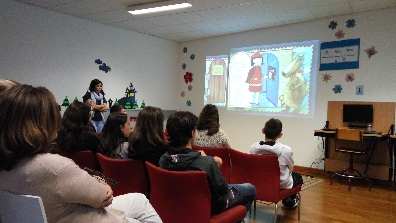 Após a visualização do áudio-livro, gravado pelos alunos da turma DOV 2, e o reconto da história, os alunos do Ocupacional 2 realizaram, nos computadores, jogos interativos com questões de compreensão e exploração da mesma, recontaram a história com recurso a fantoches e dialogaram sobre a mesma a partir das imagens de um livro adaptado.